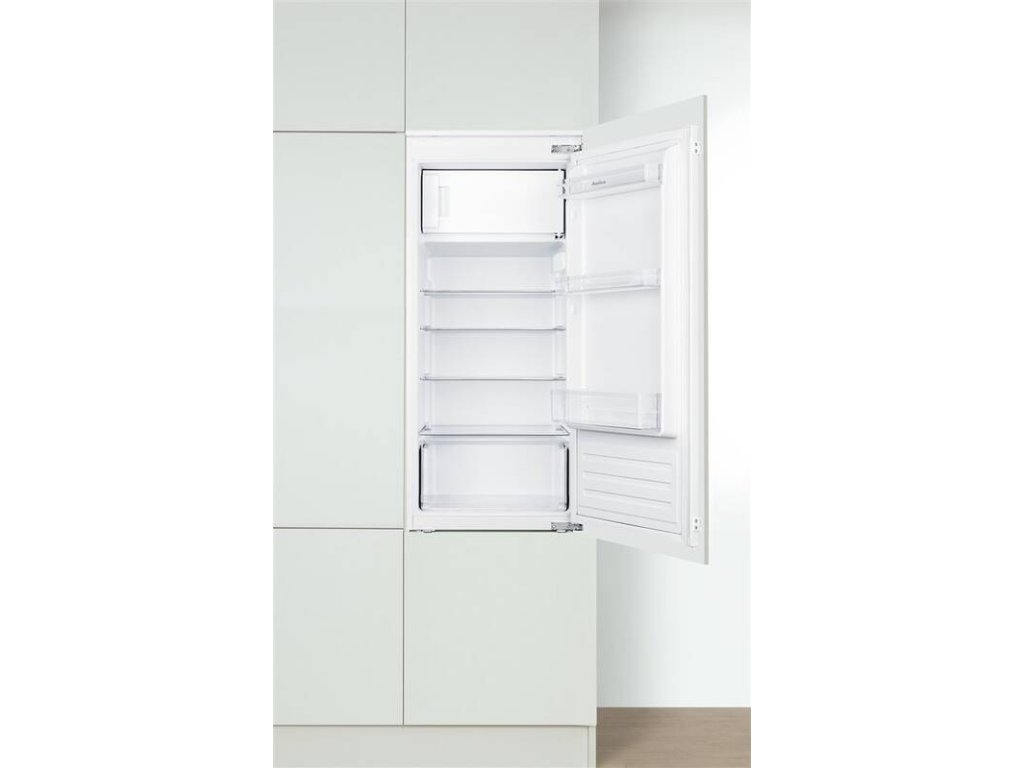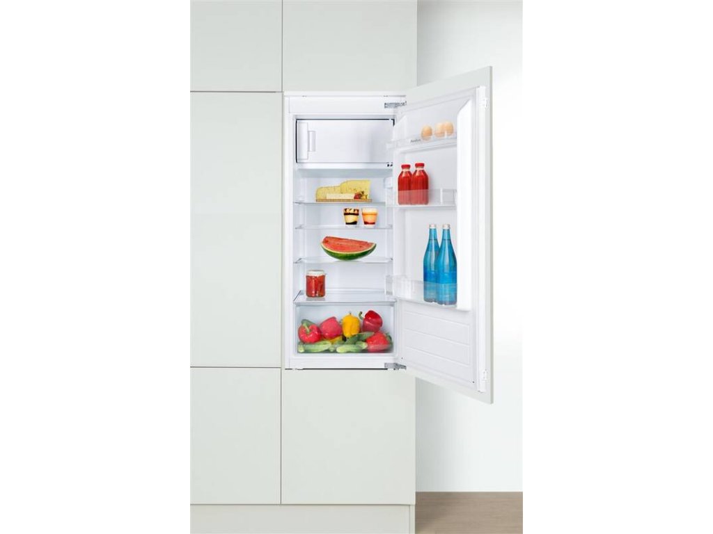 vestavná chladnička s mrazákem • výška 122,1 cm • objem chladničky 163 l / mrazničky 16 l • energetická třída E • beznámrazová technologie No Frost • LED osvětlení • pojezdy • alarm pootevřených dveří • možnost změny směru otevírání dveří • hlučnost 35 dB • V × Š × H: 122,1 × 54 × 54 cm