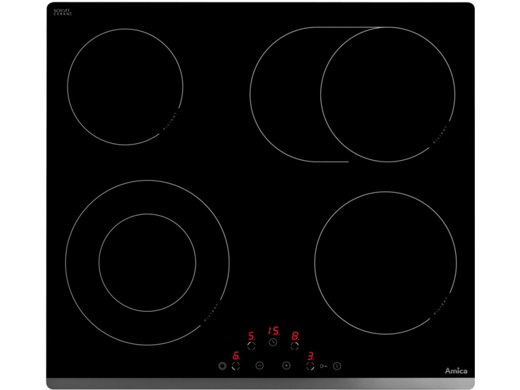 Vestavná sklokeramická varná deska se čtyřmi plotýnkami HiLight, oválnou a duální zónou. Amica DS 6423 B disponuje senzorovým ovládáním a ukazatelem zbytkového tepla. Samozřejmostí je časovač či dětská pojistka.