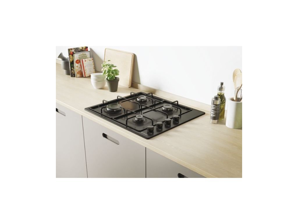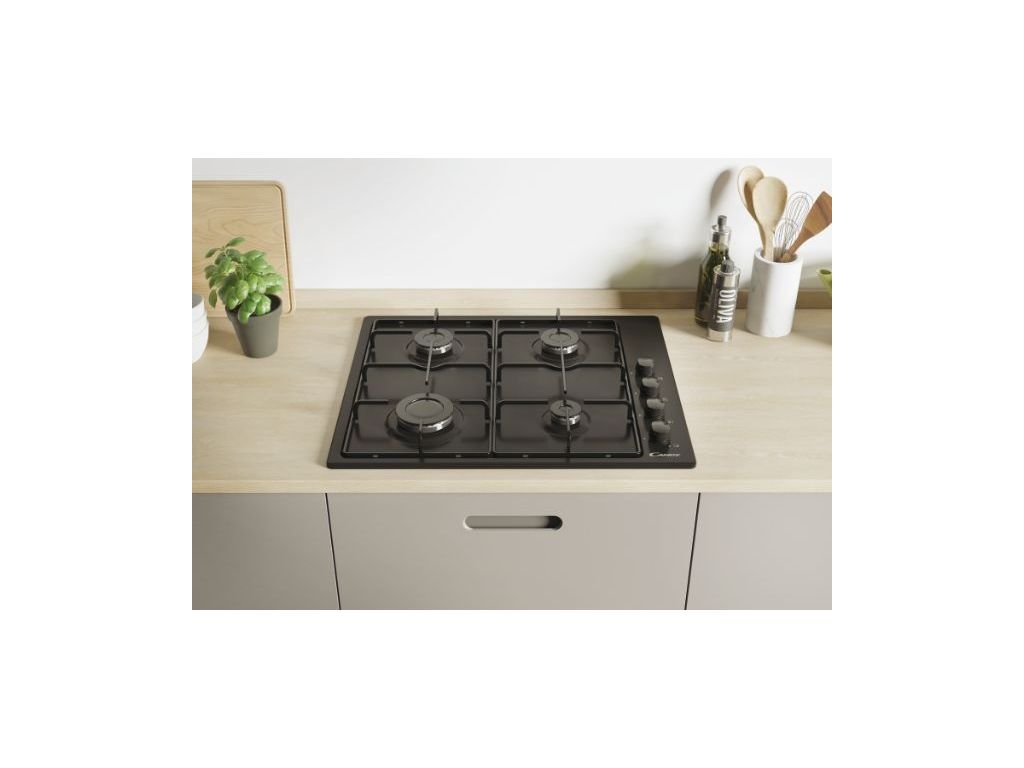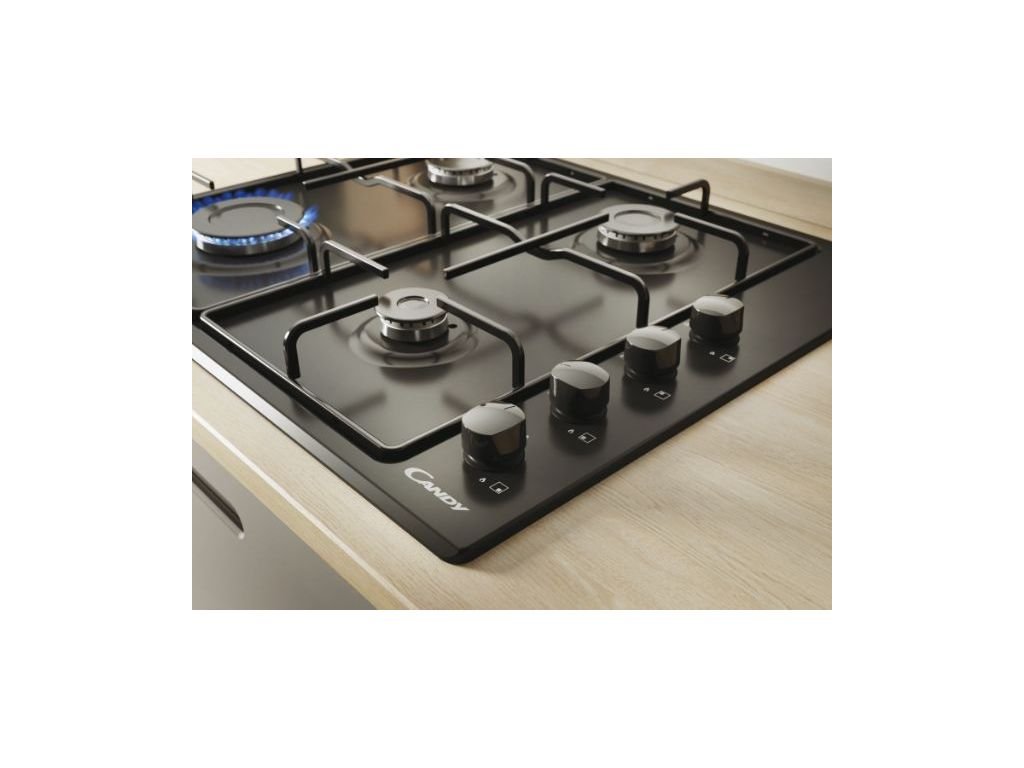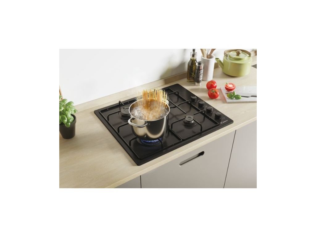 Plynová varná deska Candy CHW6LBB v černém provedení nabízí 4 plynové hořáky různého průměru a výkonu. Hořáky jsou vybaveny bezpečnostní pojistkou. Ovládání je umístěno na boku a je velmi jednoduché. Prostřednictvím 4 otočných knoflíků si nastavíte potřebný výkon s integrovaným elektrickým zapalováním. Smaltované bezpečnostní mřížky pomáhají udržet stabilitu nádob, které jsou uloženy na varné desce.