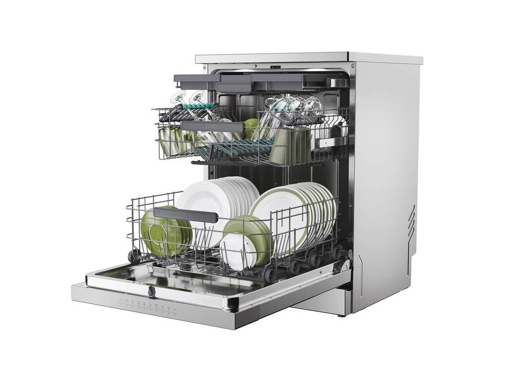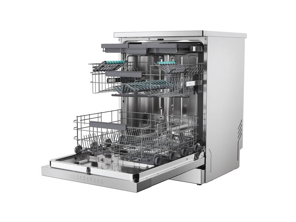 myčka nádobí • s předním panelem • šířka 59,7 cm • příborová zásuvka • 14 sad nádobí • energetická třída A • hlučnost 44 dB • automatické otevírání dvířek • záruka 15 let na motor • aplikace hOn a hlasoví asistenti • Power Wash – přídavné trysky • samočisticí nerezový filtr • funkce Addish – přidání nádobí po spuštění cyklu • bezpečnostní prvky: ochrana proti přetečení (Antioverflow) a proti úniku vody (Total Water Block) • V × Š × H: 85 × 59,7 × 59,8 cm
