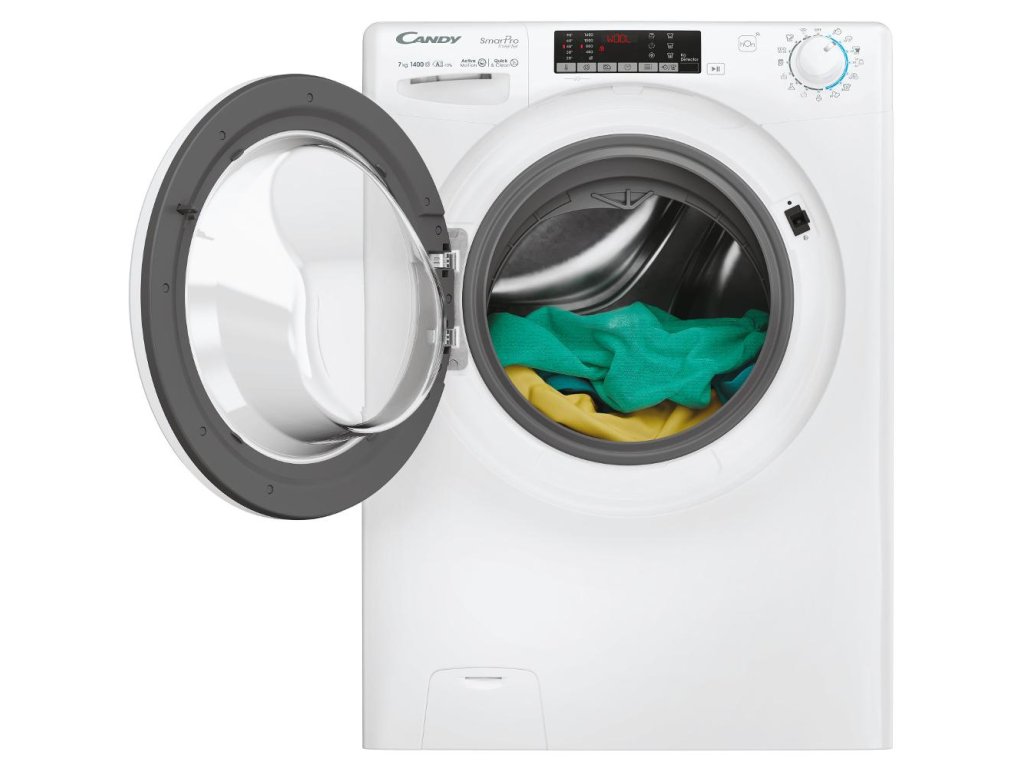 Pračka s předním plněním Candy s možností propojení s chytrým telefonem a funkcí odloženého startu. Energetická třída A, digitální displej a kapacita 7 kilogramů prádla.