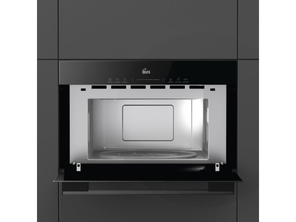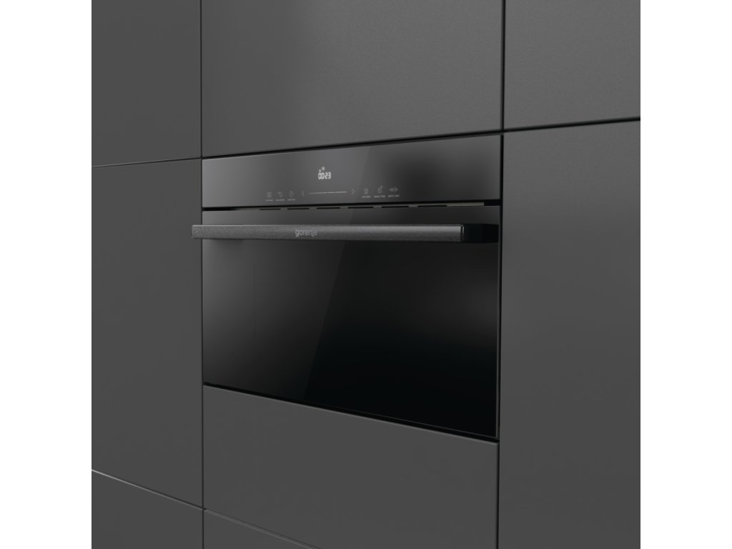 Vestavná mikrovlnná trouba Gorenje BM341M3DBGH (řada G600, rozměry 60 × 38 cm) nabízí čistý černý design s elegantními dotykově ovládanými skleněnými prvky. Vnitřní prostor je z nerezové oceli – tzv. InoxTerior – což zajišťuje lepší distribuci mikrovln, usnadňuje čištění a přispívá k lepším výsledkům vaření