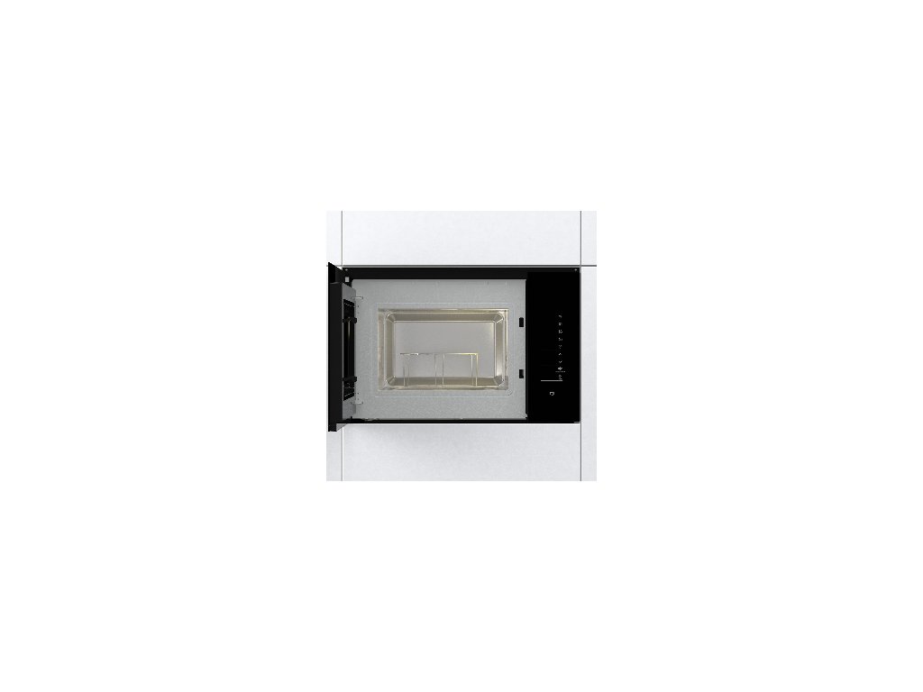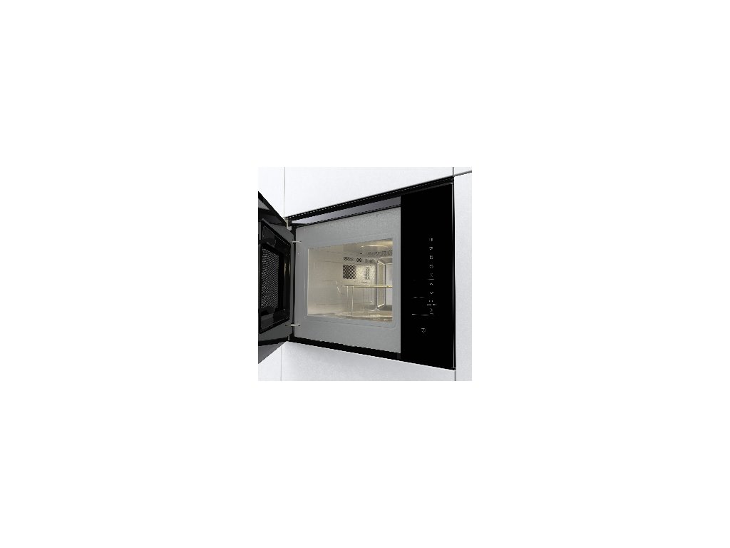 Mikrovlnná trouba vestavná, příkon 1450 W, objem 25 l, počet úrovní výkonu 5, výkon mikrovlnného ohřevu 900 W, výkon grilu 1000 W, velikost talíře 31,5 cm, rozmrazování a gril, otočný talíř, barva černá