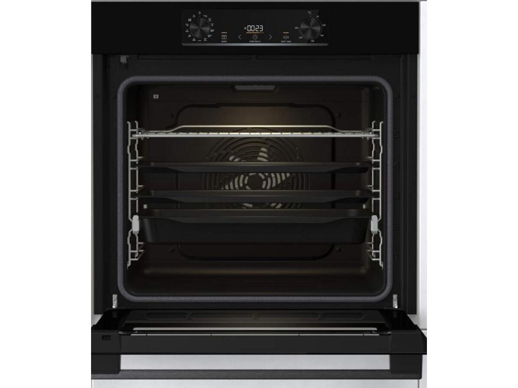 Vestavná elektrická trouba Gorenje BPS6737E07B v černém provedení má objem 77 l. Můžete ji ovládat pomocí zasouvacích knoflíků doplněných Icon LED programovacími hodinami. Nabízí 11 funkcí pro přípravu jídla včetně funkce grilu, pečení v páře, rychlý předehřev a rozmrazování. Disponuje částečně výsuvnými teleskopickými lištami na 1 úrovni, vnitřním osvětlením a pyrolytickým čištěním. Součástí je 1 hluboký plech, 2 mělké smaltované plechy a rošt.
