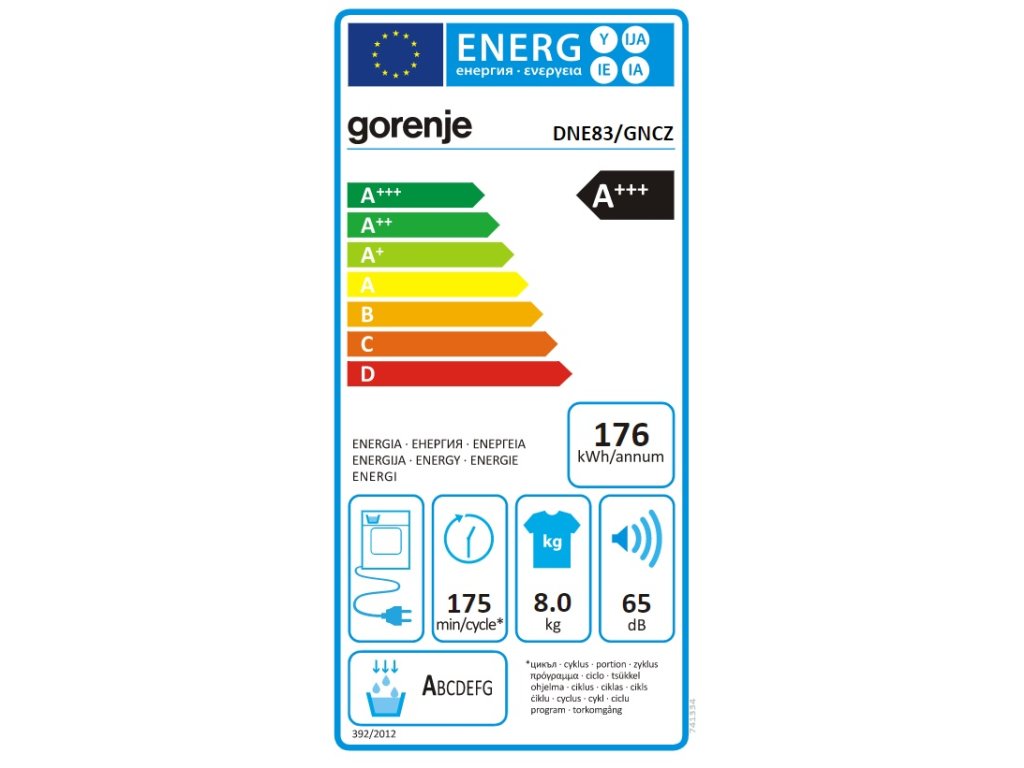 Kondenzační sušička prádla Gorenje DNE83/GNCZ s tepelným čerpadlem se řadí díky nízké spotřebě do úsporné energetické třídy A+++. Nabízí kapacitu sušení až 8 kg prádla.