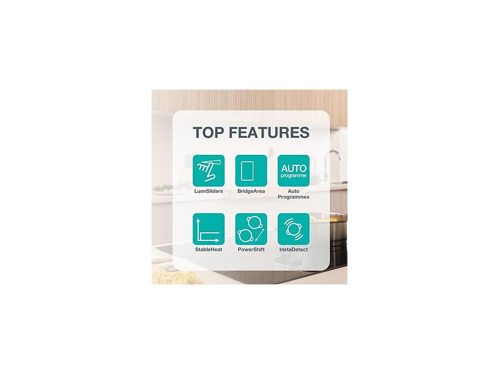 - Lev á přední varná zóna: indukční zóna okta (osmiúhelníkový induktor), rozměr 210 × 195 mm, výkon 2300 W, s PowerBoost 3000 W