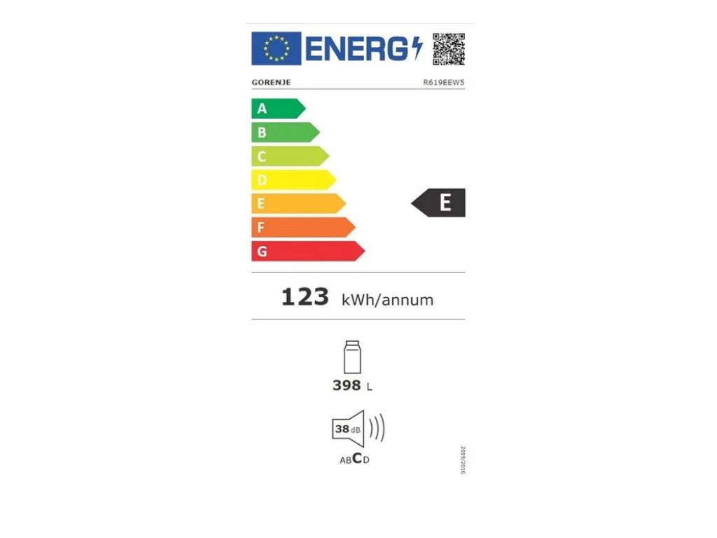 Volně stojící jednodveřová monoklimatická lednice Gorenje R619EEW5 řady Essential je vyrobena v bílém barevném provedení s vertikálním madlem o objemu 398 l. Se svou roční spotřebou 123 kWh spadá do energetické třídy E.