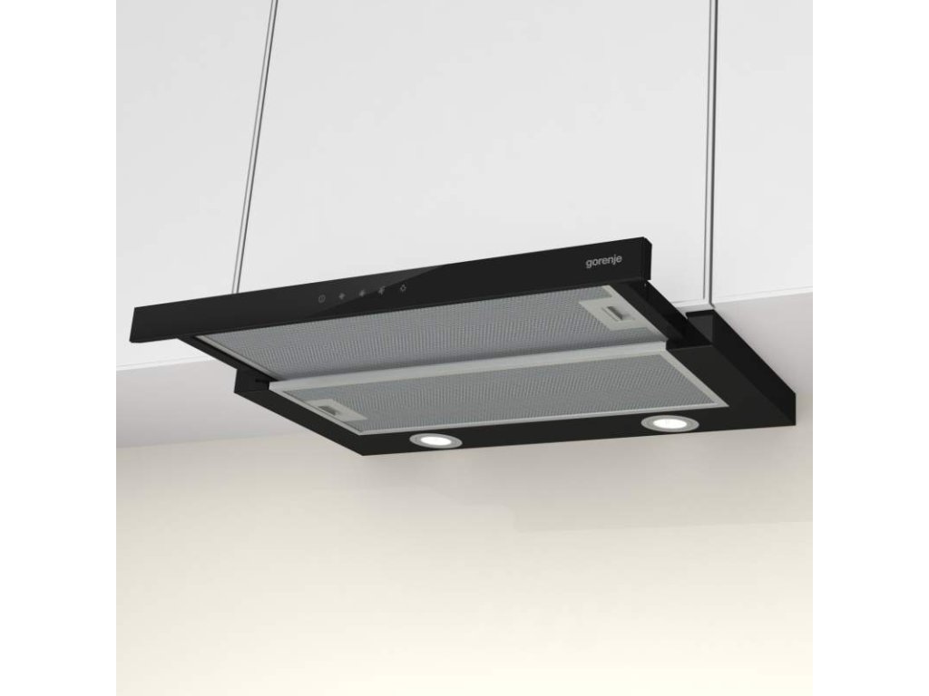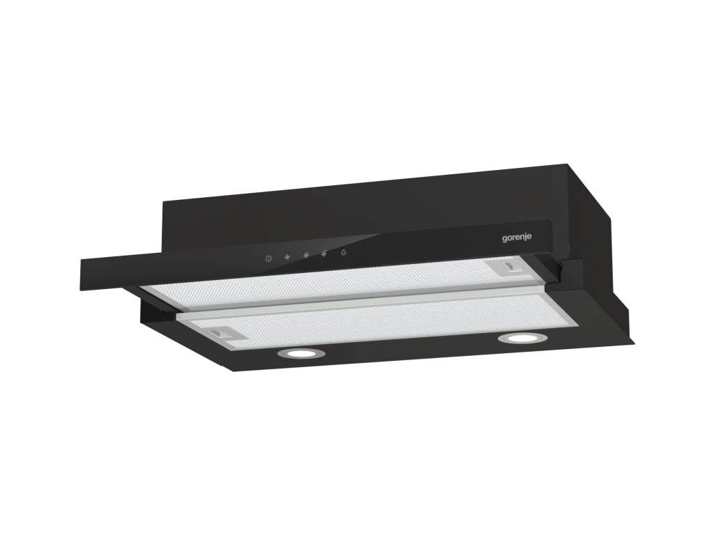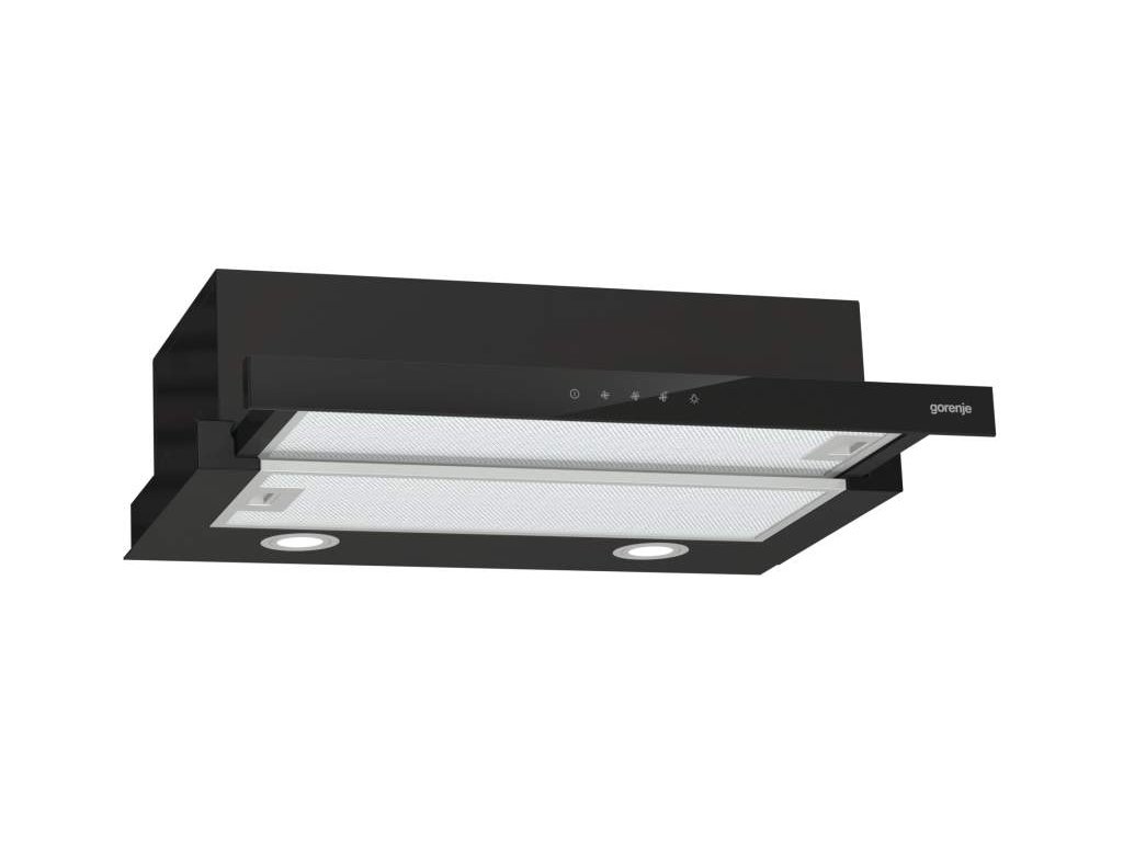 Vestavěný odsavač par Gorenje TH64E4BG v černém provedení je zařazen do energetické třídy C. Jeho provoz je možný s recirkulací nebo odtahem do komína. Nabízí 3 stupně výkonu, které lze nastavit pomocí elektronického dotykového ovládání. Maximální výkon odtahu (do komína) je 450 m³ / hod. s průměrem odtahové trubky 150 mm a výkon při recirkulaci 190 m³ / hod. Pracovní desku pod odsavačem par Gorenje TH64E4BG zpřehledňuje LED osvětlení. Součástí je i omyvatelný hliníkový filtr s polyuretanovou pěnou, který zachycuje mastnotu. Maximální hlučnost dosahuje 71 dB. Šířka 60 cm.