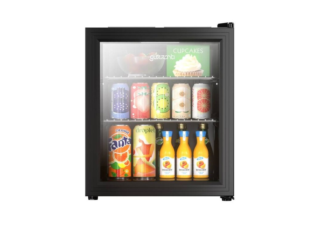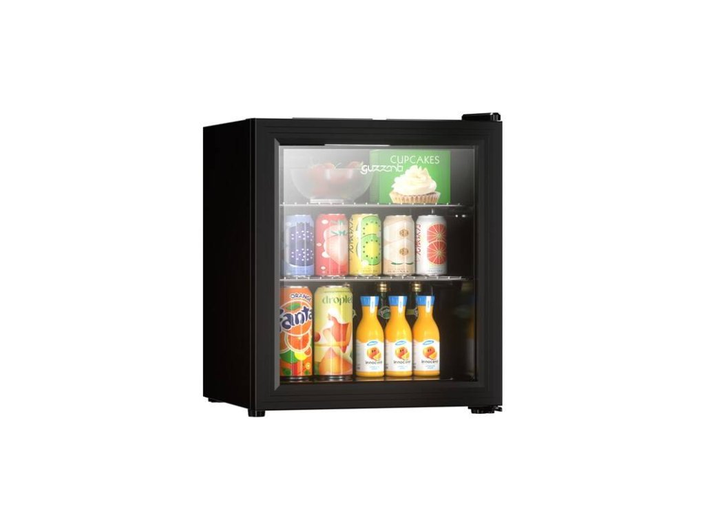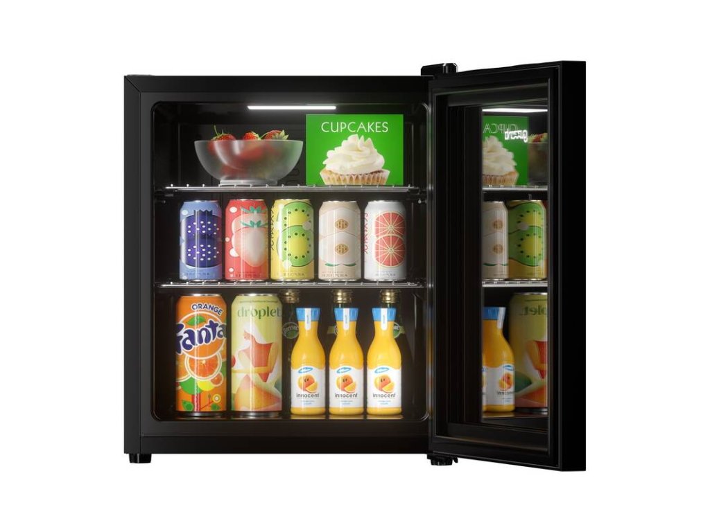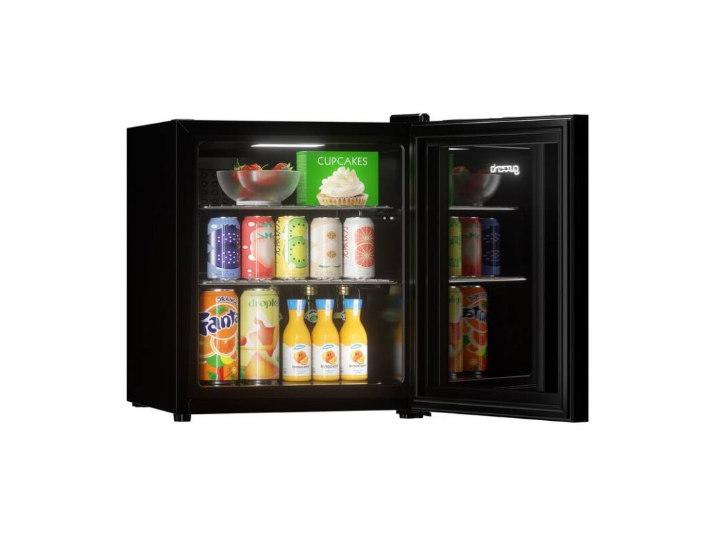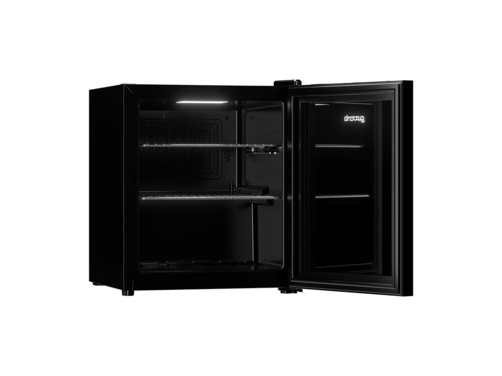 chladicí vitrína • objem 46 l • energetická třída C • hlučnost 42 dB • nastavitelná teplota od 3 °C • prosklené temperované dveře • 2 drátěná police • LED osvětlení • 53 × 44 × 47 cm Váha 18 kg