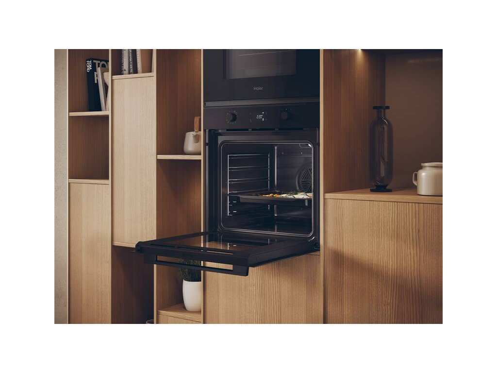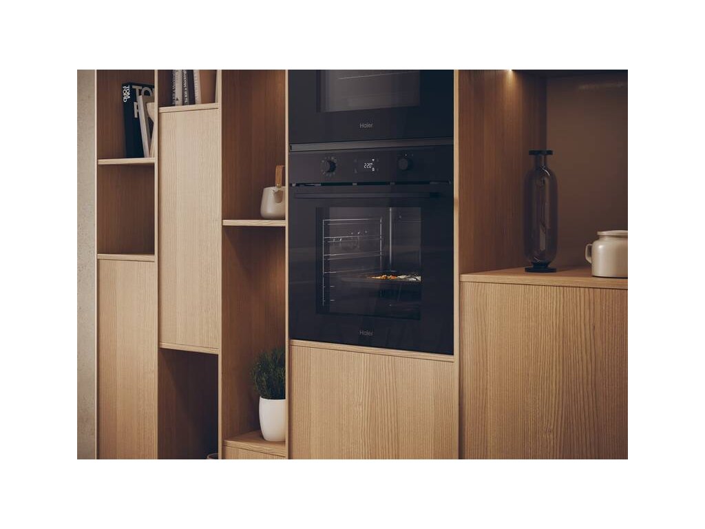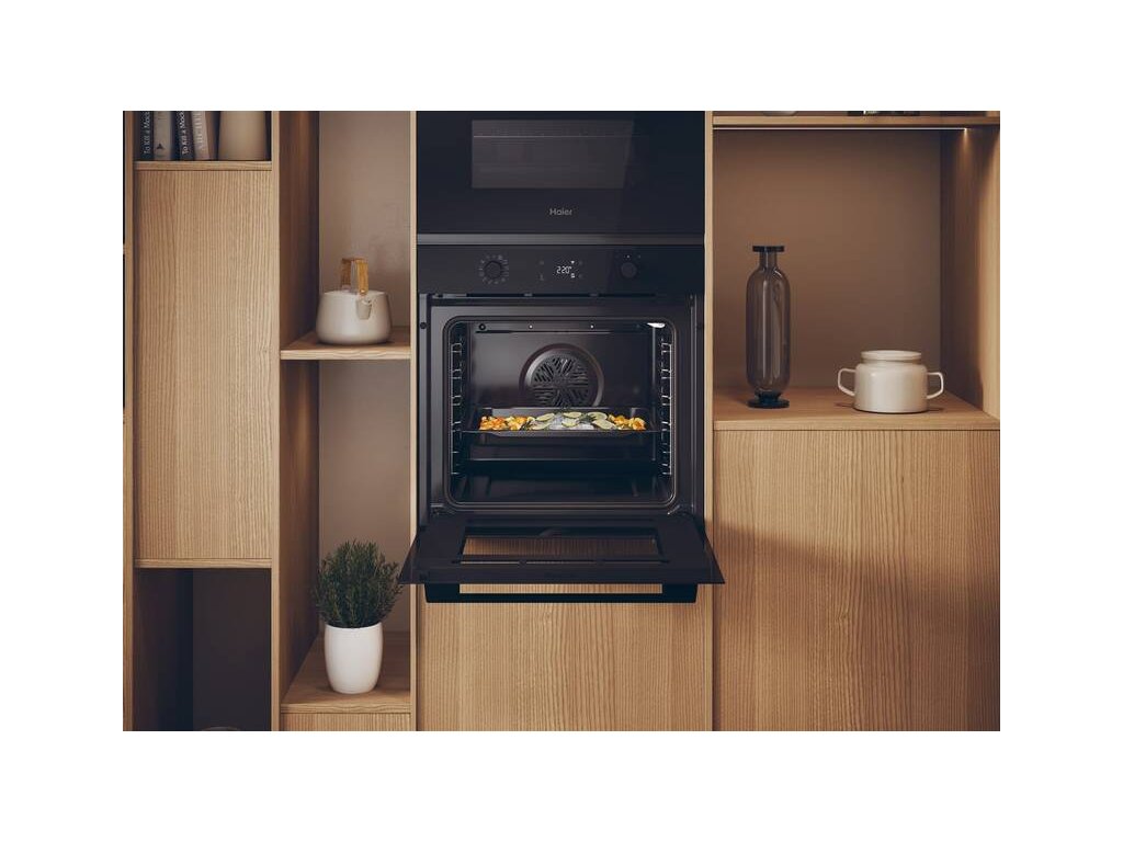 Vestavná trouba HAIER H6 ID2P3B3EHTB ID Series 2 snoubí praktické funkce, pokročilé technologie a elegantní minimalistický design. S velkým objemem 78 litrů a možností pečení až na 6 úrovních najednou je ideálním pomocníkem pro každodenní i slavnostní vaření.Trouba HAIER H6 ID2P3B3EHTB ID Series 2 je vybavena 5 hlavními programy pečení (Eco, Statický, Víceúrovňové pečení, SuperGril, Gratinování), 3 programy Everyday Cooking (Maso, Ryby, Zelenina) a speciálními funkcemi jako Pizza program (až 300 °C) nebo Jolly, díky kterému si můžete přidat vlastní oblíbenou funkci přes aplikaci hOn.Uživatelský komfort zajišťují dotykové ovládání ID Superior, zamačkávací Push-Pull knoflíky, vnitřní osvětlení, tichý systém Soft Close a snadné Click & Clean čištění dvířek. Trouba se také čistí hydrolytickým způsobem, což šetří čas i energii.WiFi + Bluetooth připojení umožňuje vzdálené ovládání a OTA aktualizace přinášejí nové funkce bez nutnosti zásahu technika.Trouba spadá do energetické třídy A++, takže je i mimořádně úsporná. Součástí balení je bohaté příslušenství – 1 rošt, hluboké plechy (20 a 40 mm), teleskopický výsuv a nerezové postranní pojezdy pro pohodlné vkládání plechů.