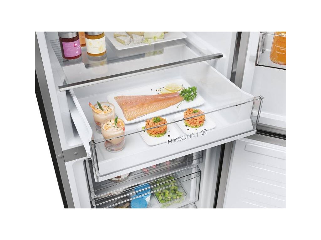 beznámrazová chladnička s mrazákem • výška 185 cm • objem chladničky 235 l / mrazničky 117 l • energetická třída D • 20 let záruka na kompresor • No Frost – beznámrazová technologie • Air Surround Fresher Tech – optimální cirkulace vzduchu • rychlé chlazení • rychlé mrazení • Wi-Fi • komunikace s mobilem • LED displej • možnost změny směru otevírání dveří • hlučnost 35 dB • V × Š × H: 185 × 59,5 × 66,7 cm