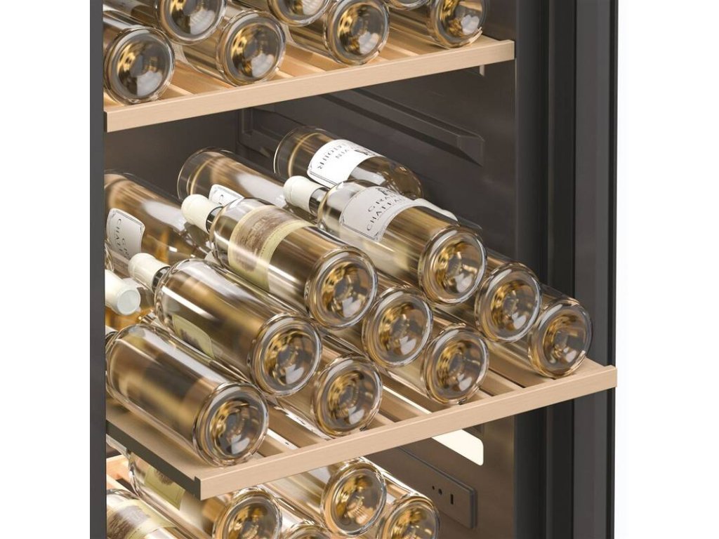 vinotéka • energetická třída E • hlučnost 35 dB • 247 lahví • +5 až +20 °C • 1 zóna • digitální displej • Natural Air Flow – perfektní vlhkost a distribuce vzduchu • Anti-UV filtr ve dveřích • Antivibrační systém • zámek • 5 polic • dřevěné police • V × Š × H: 190 × 59,5 × 63,9 cm