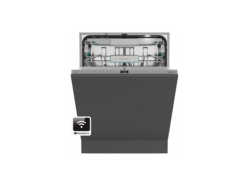 Plně integrovaná myčka Hisense s automatickým otevíráním dveří a dotykovým ovládáním. Energetická třída A, indikátor konce mytí a celková kapacita 16 sad nádobí.