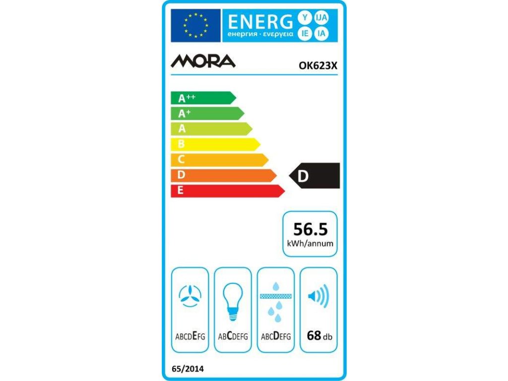 Komínový odsavač par Mora OK 623 X v nerezovém provedení je zařazen do energetické třídy D. Maximální výkon odsávání dosahuje 395 m³/h. Digestoř je možné namontovat buď s odtahem do komína či bez odtahu, díky funkci recirkulace. Vybrat a nastavit si můžete ze 3 rychlostí výkonu pomocí posuvného ovládání, které je umístěno vepředu. Maximální hlučnost dosahuje 68 dB. Pracovní plocha pod odsavačem je osvětlena LED osvětlením s výkonem 3 W. Šířka: 60 cm.
