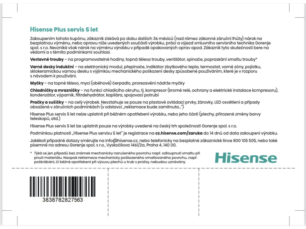 Prodlužte si záruku o dalších 36 měsíců (nad rámec zákonné záruční lhůty) zakoupením kupónu Hisense Plus servis 5 let u svého prodejce. Tato nabídka se vztahuje na kategorie vestavné trouby, indukční varné desky, myčky, chladničky a mrazničky, pračky a sušičky. Podmínkou platnosti prodloužené záruky je registrace kupónu prostřednictvím formuláře uvedeného níže, a to nejpozději do 8 týdnů od data nákupu.